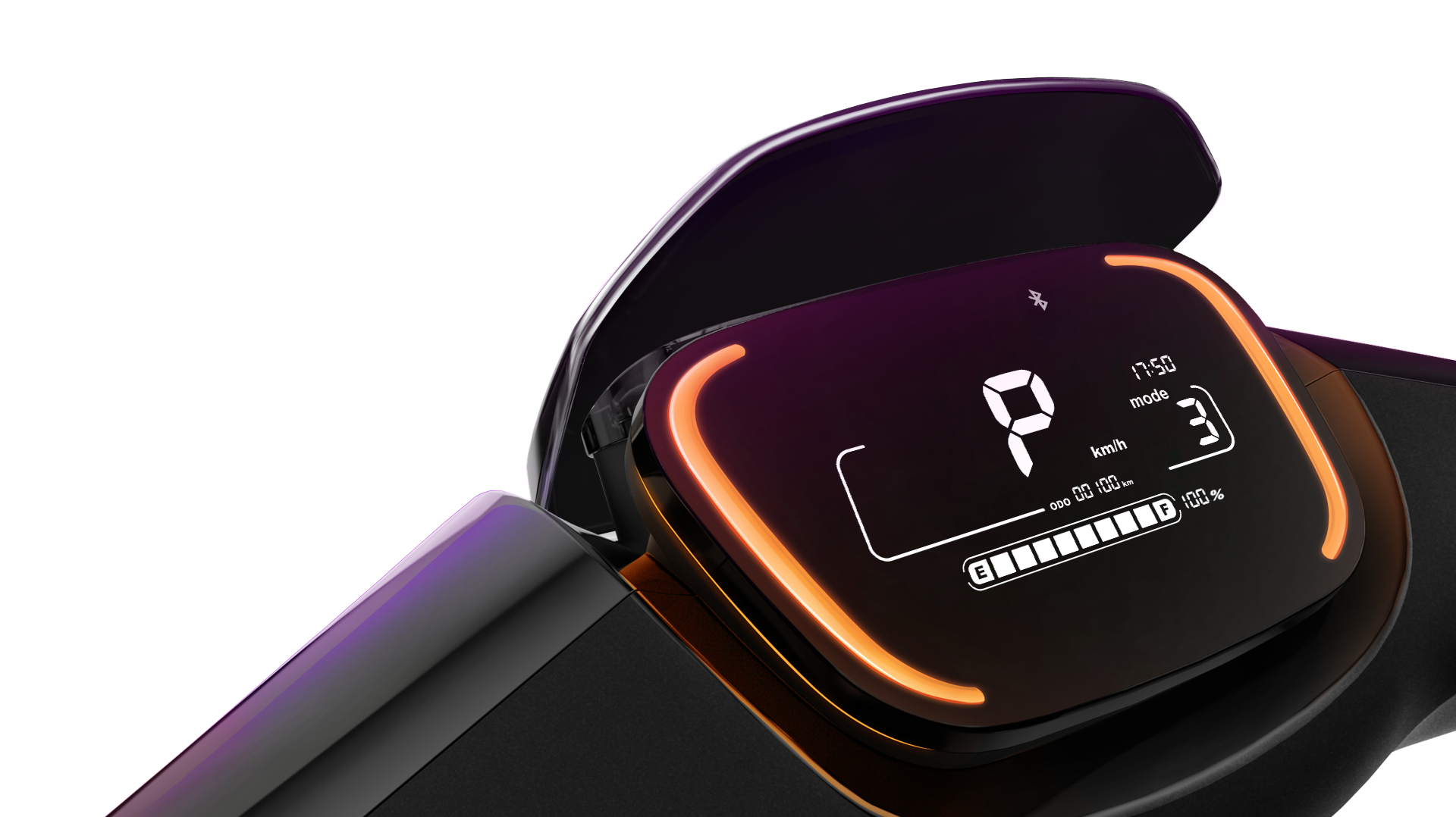 Het intuïtieve digitale en gekleurde dashboard geeft de bestuurder in één oogopslag alle nodige informatie: snelheid, accuniveau, verschillende meldingen (richtingaanwijzers, foutcode, READY-bord enz.), Rijmodus, Bluetooth-connectiviteit en nog veel meer. De LED-lampjes aan beide uiteinden van het scherm veranderen van kleur afhankelijk van de status van de eScooter: