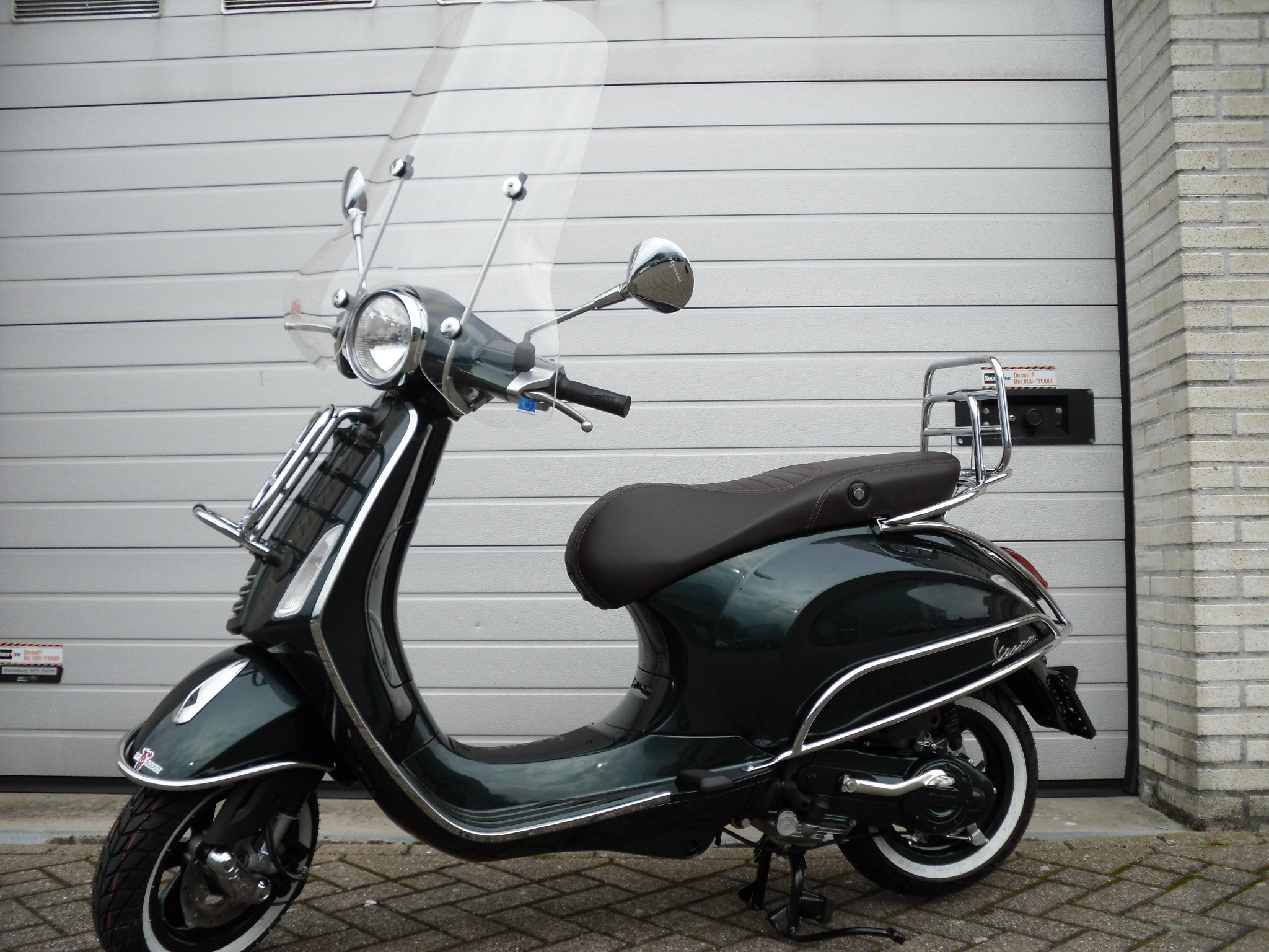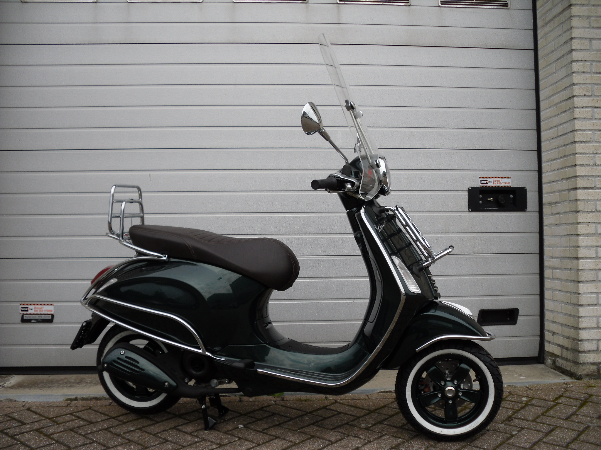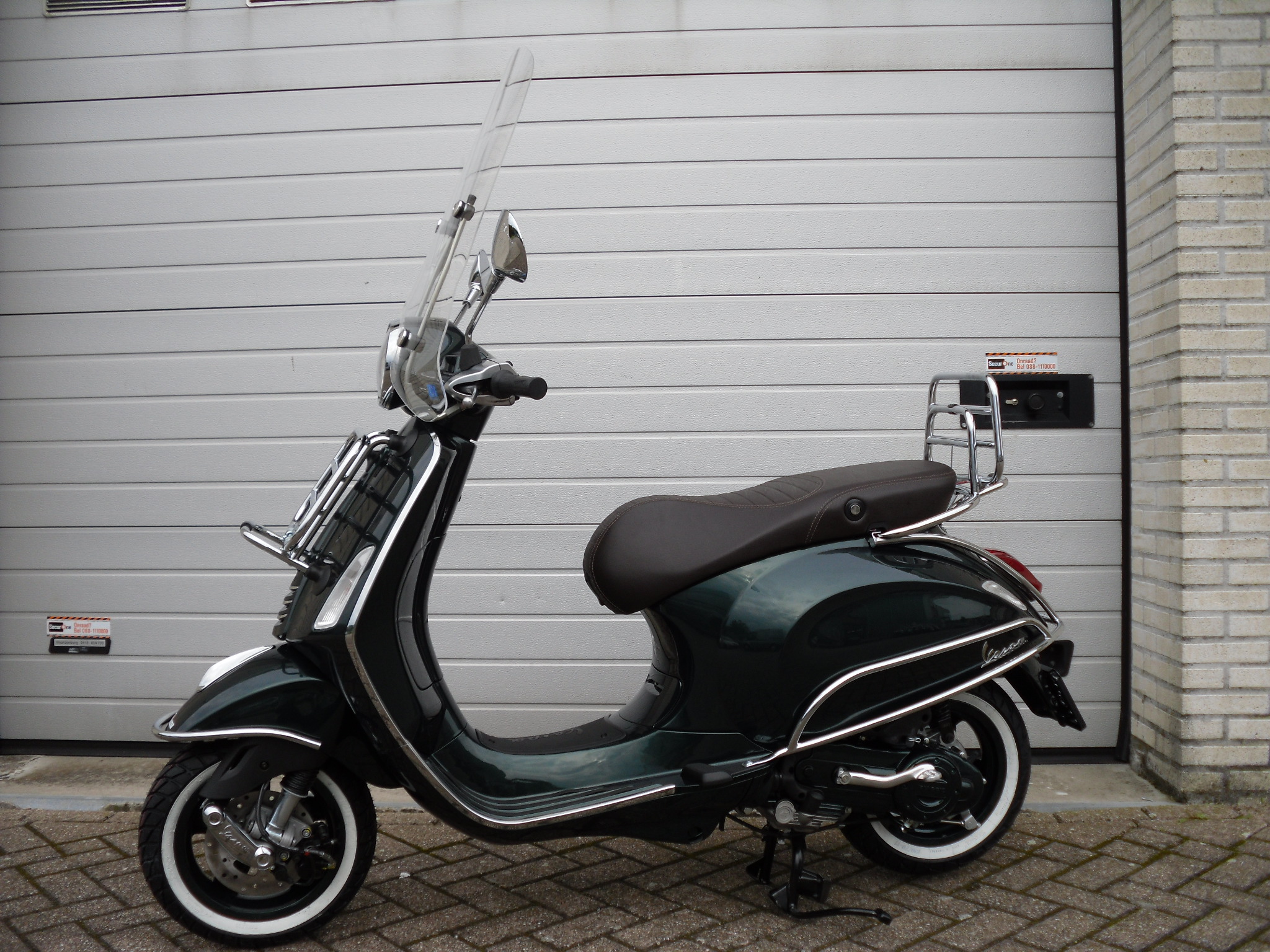 Een unieke Vespa volledig custom gespoten in een schitterende klassieke kleur, met meegepoten binnenbeplating, meegespoten velgen carterdeksel en hitteschild. White wall bandenset voor de echte retro look! Schitterend origineel bruin Vespa touring zadel. Chrome achterdrager, chrome valbeugels achter en chrome spatbordbeugel voor de chroom accenten. Originele voordrager voor de Vespa Look. Hoog windscherm.